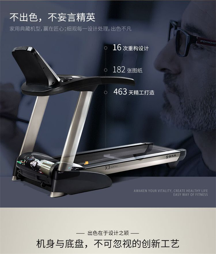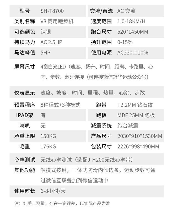 舒華商用跑步機(jī)SH-T860(V6)采用商用大跑臺,手握心律測試,全跑臺減震護(hù)足的設(shè)計(jì),對您跑步中的膝蓋進(jìn)行全方位的呵護(hù),選用手握式感應(yīng)片測心率等數(shù)據(jù),跑步面積達(dá)580×1570mm,可承受180kg的使用者使用。