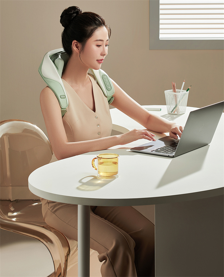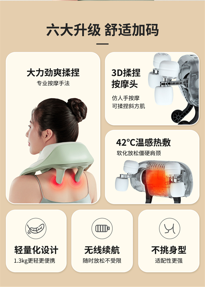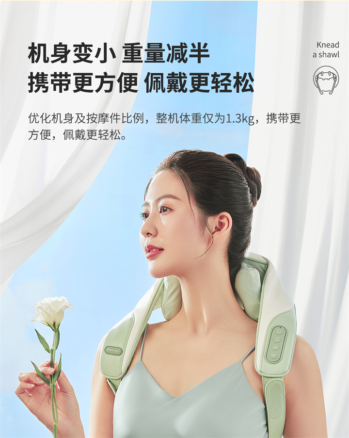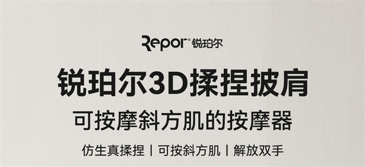 銳珀?duì)?/a>揉捏披肩RP-R7,全新感受,可按摩斜方肌的按摩器,覆蓋肩頸,將中醫(yī)揉捏技術(shù)與數(shù)字化融合,模擬中醫(yī)人手開合夾、捏、揉、推等按摩手法,盡情釋放身體疲憊,升級降噪直流純銅無刷電機(jī),重量更輕,無線,攜帶更方便,大面積熱敷,熱力柔和滲透舒緩。