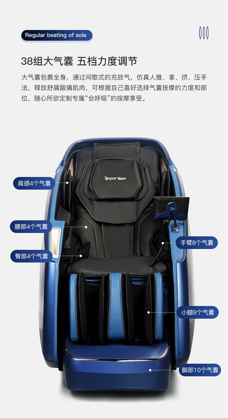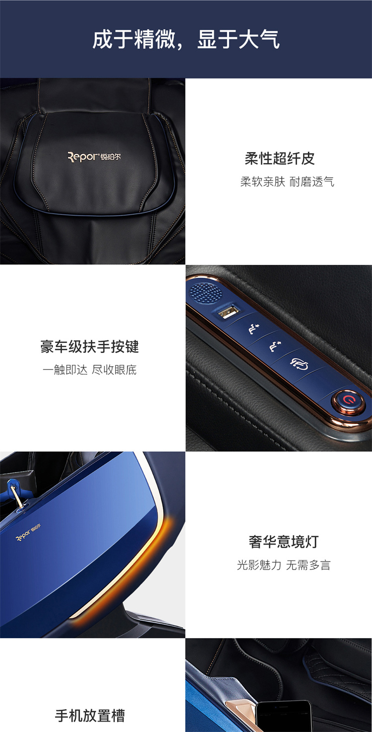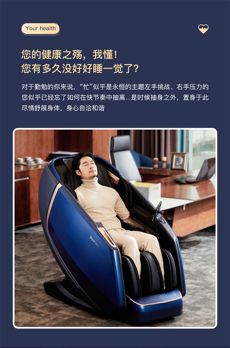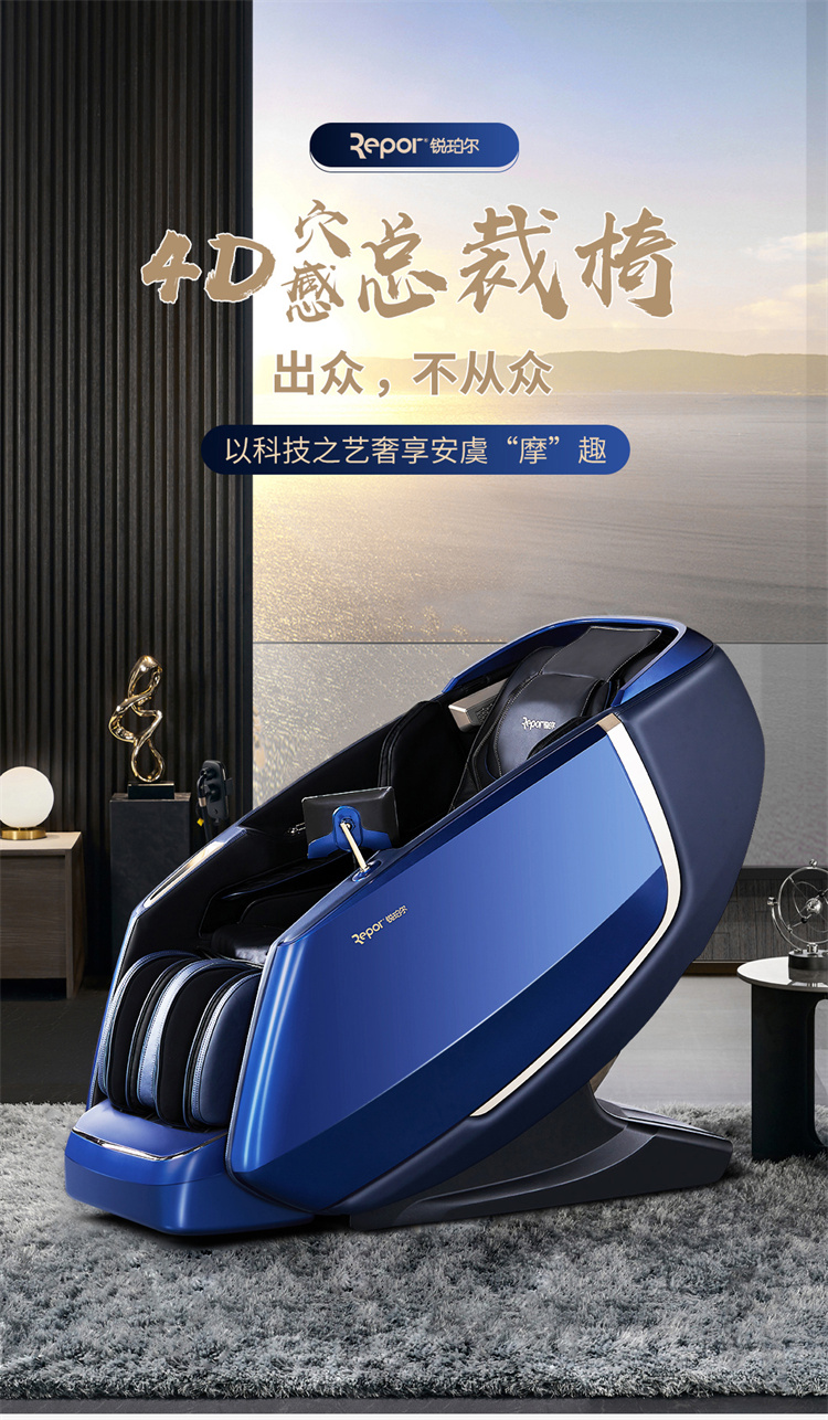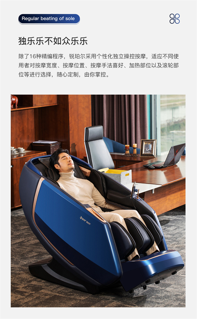 銳珀爾集十余年技術(shù)積累,傾力打造銳珀爾新款總裁4D穴感總裁椅S500,擁有全新的AI智能語音,小腿溫?zé)崛啻?、腳底震動、4D機械手等全新功能創(chuàng)新,智能健康體測,可以檢測血氧、心率、微循環(huán)等數(shù)值,通過大數(shù)據(jù)分析,給您提供合理的改善方法,時刻關(guān)注您的健康狀況;超大液晶智能觸控,專為總裁量身打造的特色按摩程序,20分鐘快速補充精力,多種按摩程序,滿足全家人的需求。