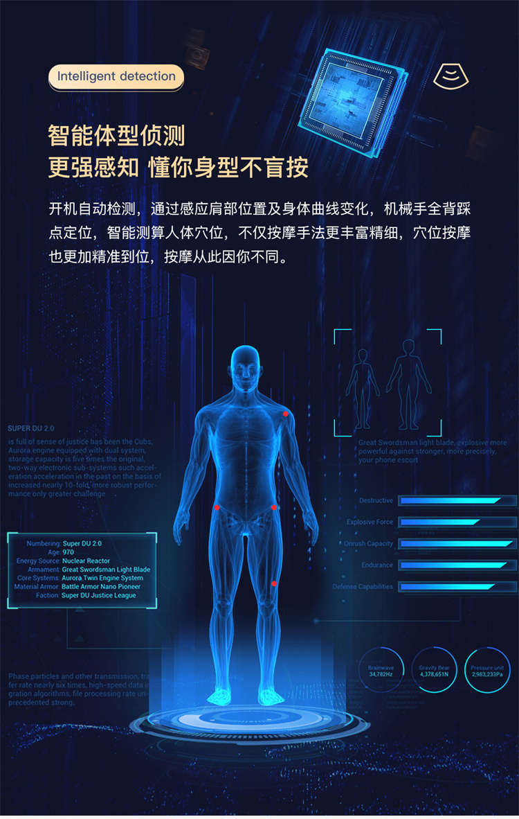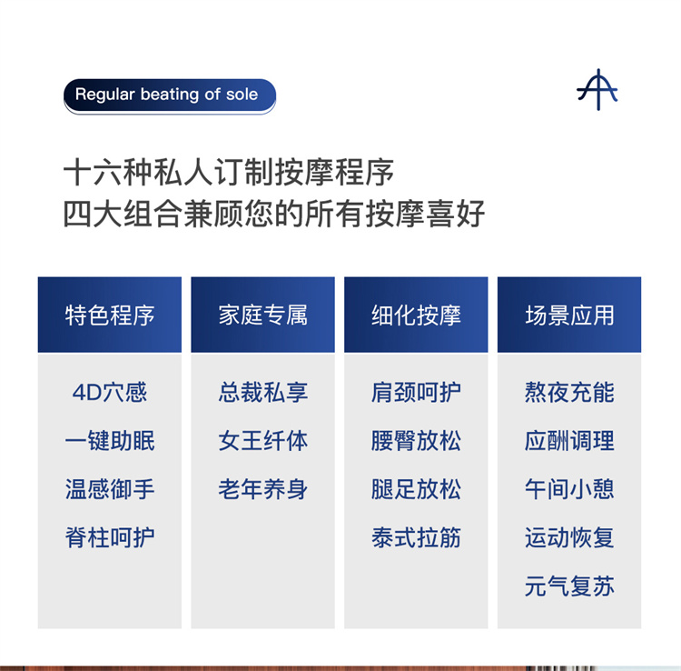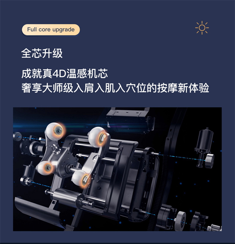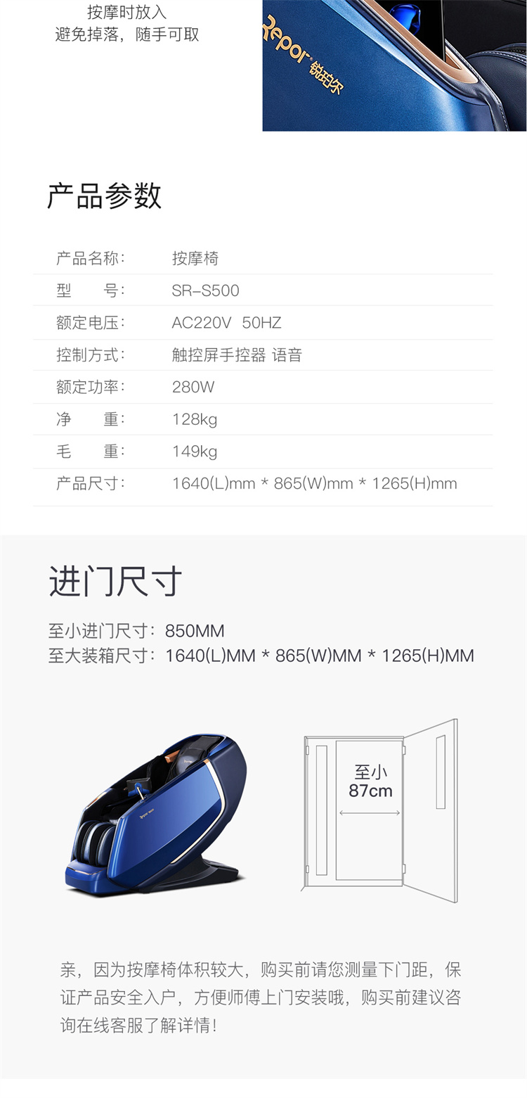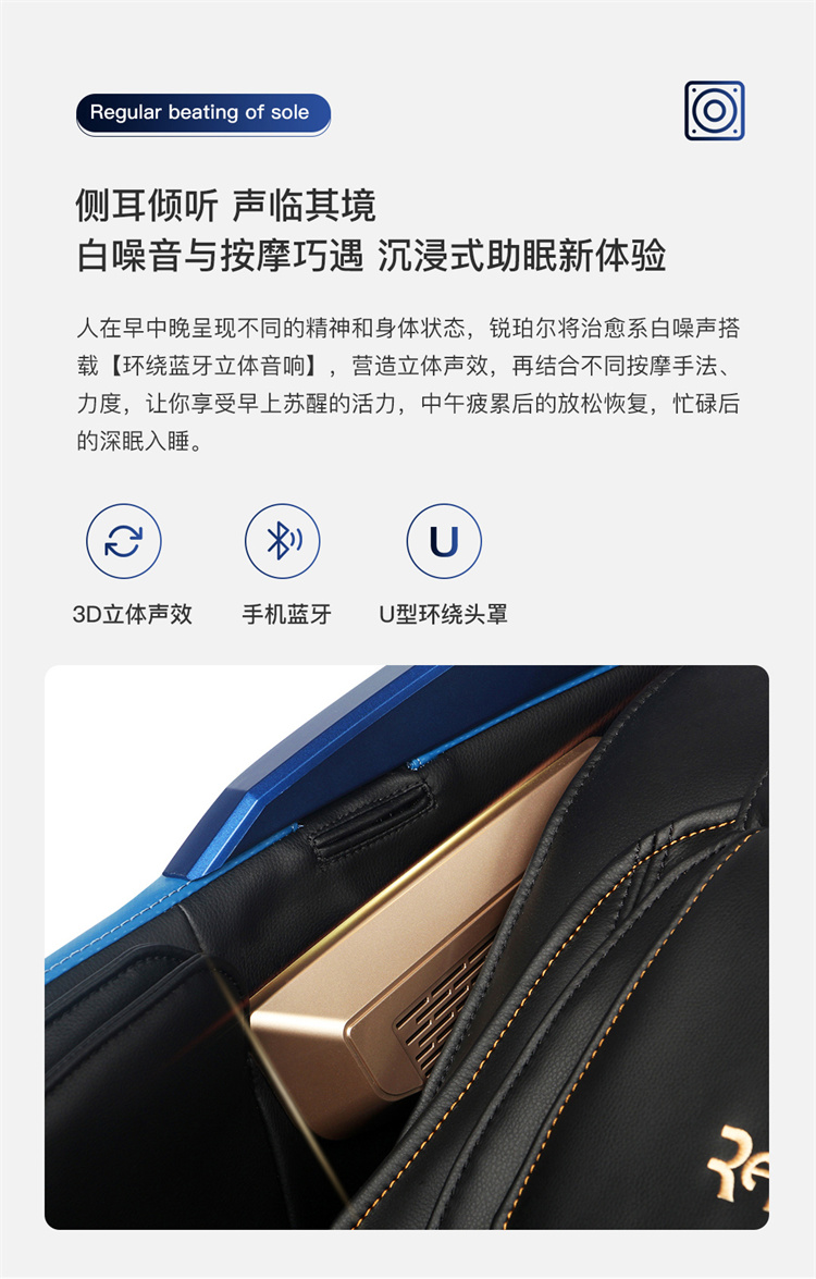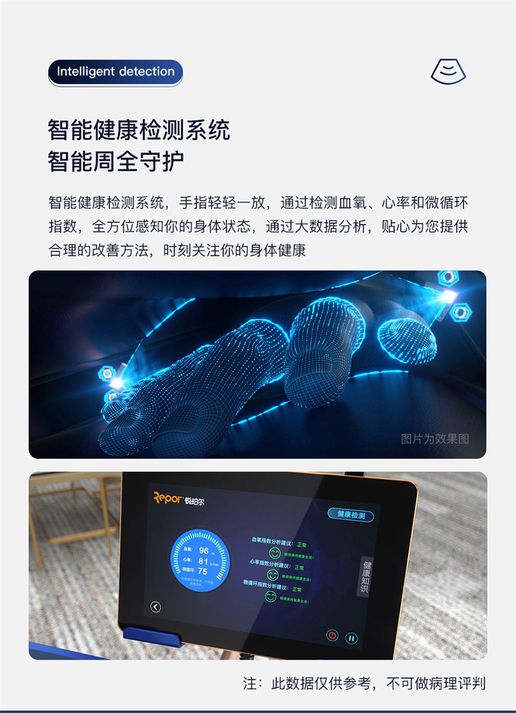 銳珀爾集十余年技術(shù)積累,傾力打造銳珀爾新款總裁4D穴感總裁椅S500,擁有全新的AI智能語音,小腿溫?zé)崛啻?、腳底震動、4D機械手等全新功能創(chuàng)新,智能健康體測,可以檢測血氧、心率、微循環(huán)等數(shù)值,通過大數(shù)據(jù)分析,給您提供合理的改善方法,時刻關(guān)注您的健康狀況;超大液晶智能觸控,專為總裁量身打造的特色按摩程序,20分鐘快速補充精力,多種按摩程序,滿足全家人的需求。
