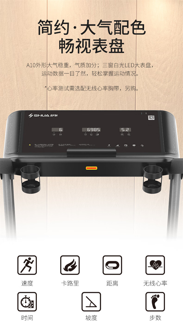 舒華家用跑步機(jī)SH-T5100持續(xù)馬力達(dá)1.25HP,具有500×1350mm的跑臺(tái),運(yùn)用無(wú)線心率接收模塊監(jiān)測(cè)心率,運(yùn)用6位硅膠減震設(shè)計(jì),最大承重是126kg,可以滿足大多數(shù)家庭的使用。