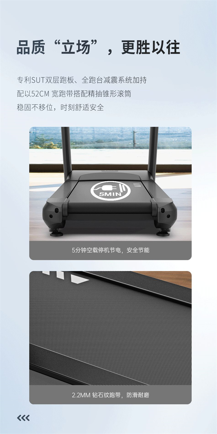 舒華跑步機(jī)SH-T5500采用T18mm的跑板,T1.6 鉆石紋的跑帶,運(yùn)用6位硅膠減震,對您跑步中的膝蓋進(jìn)行全方位的呵護(hù),選用手握心率測試,跑步面積達(dá)480×1350mm,可承受126kg的使用者使用。
